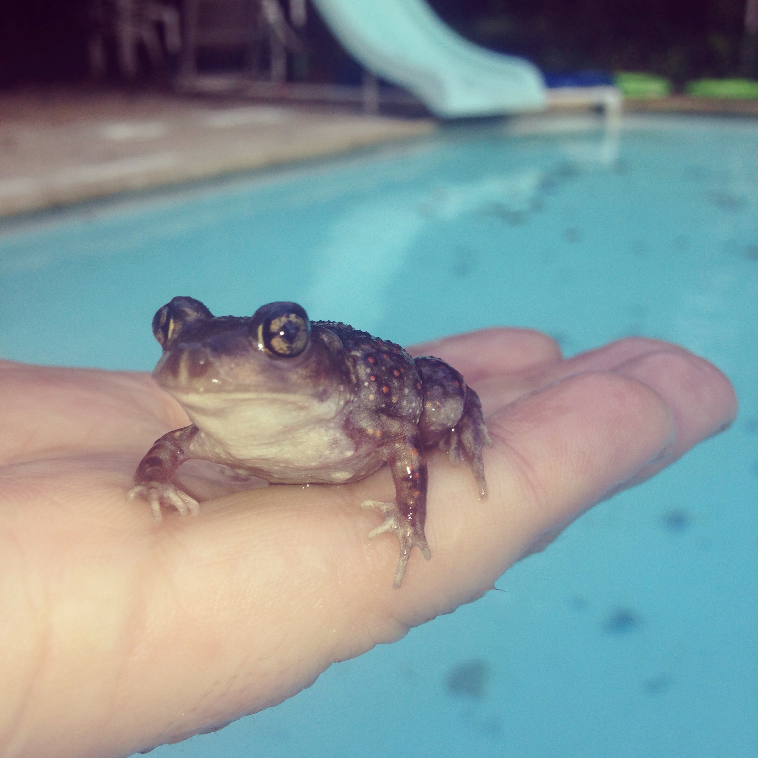 NdkdMade a new frog friend in Baltimore. He assured me he wasn’t poisonous but I’m not sure. He was a bit sneaky to talk to and the Army Lover fished him out of a private pool which he was swimming in with no permission. I liked him, I just didn’t trust him. His red spots were a bit of a give away. I hope he poisoned Rochie!!!